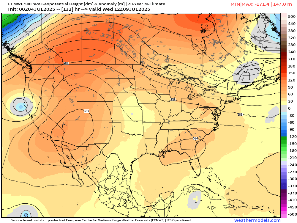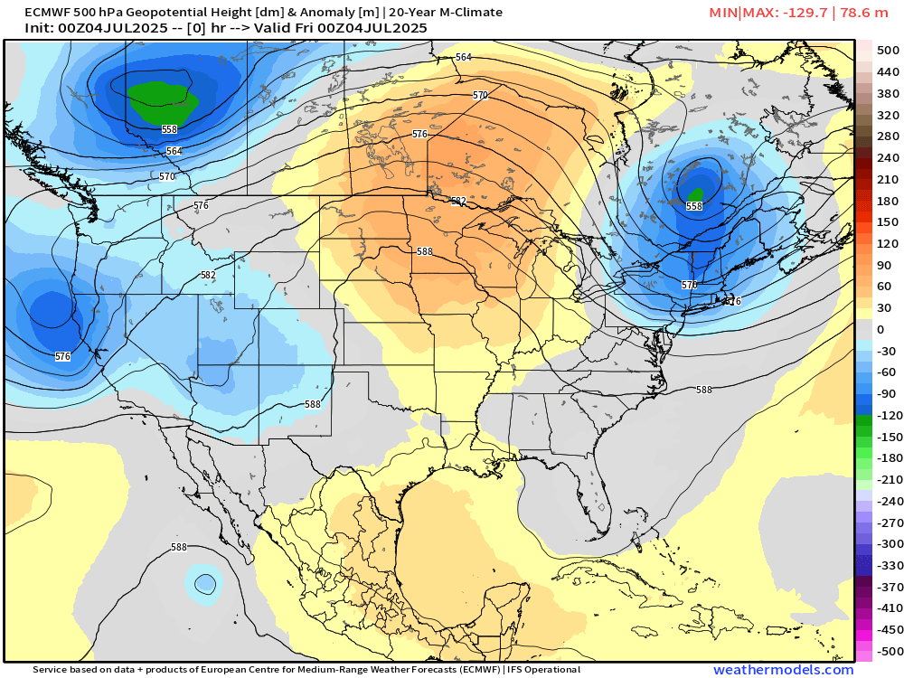 Looking at a wide view, we don't see a really dominant "summer" type weather pattern for most of the lower-48. Some weak troughing giving us the unsettled weather this weekend across the west, some ridging near the Great Lakes, and a fast moving trough over the Northeast.