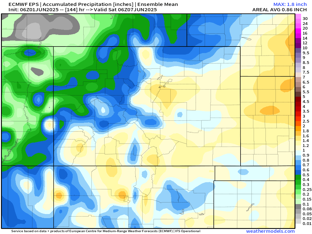 The next 6 days look promising with respect to some of the ensemble data. Widespread 1" rainfall is possible for most of the front range between now and next Saturday. With convection likely under these showers and storms, localized heavier amounts aren't out of the question!