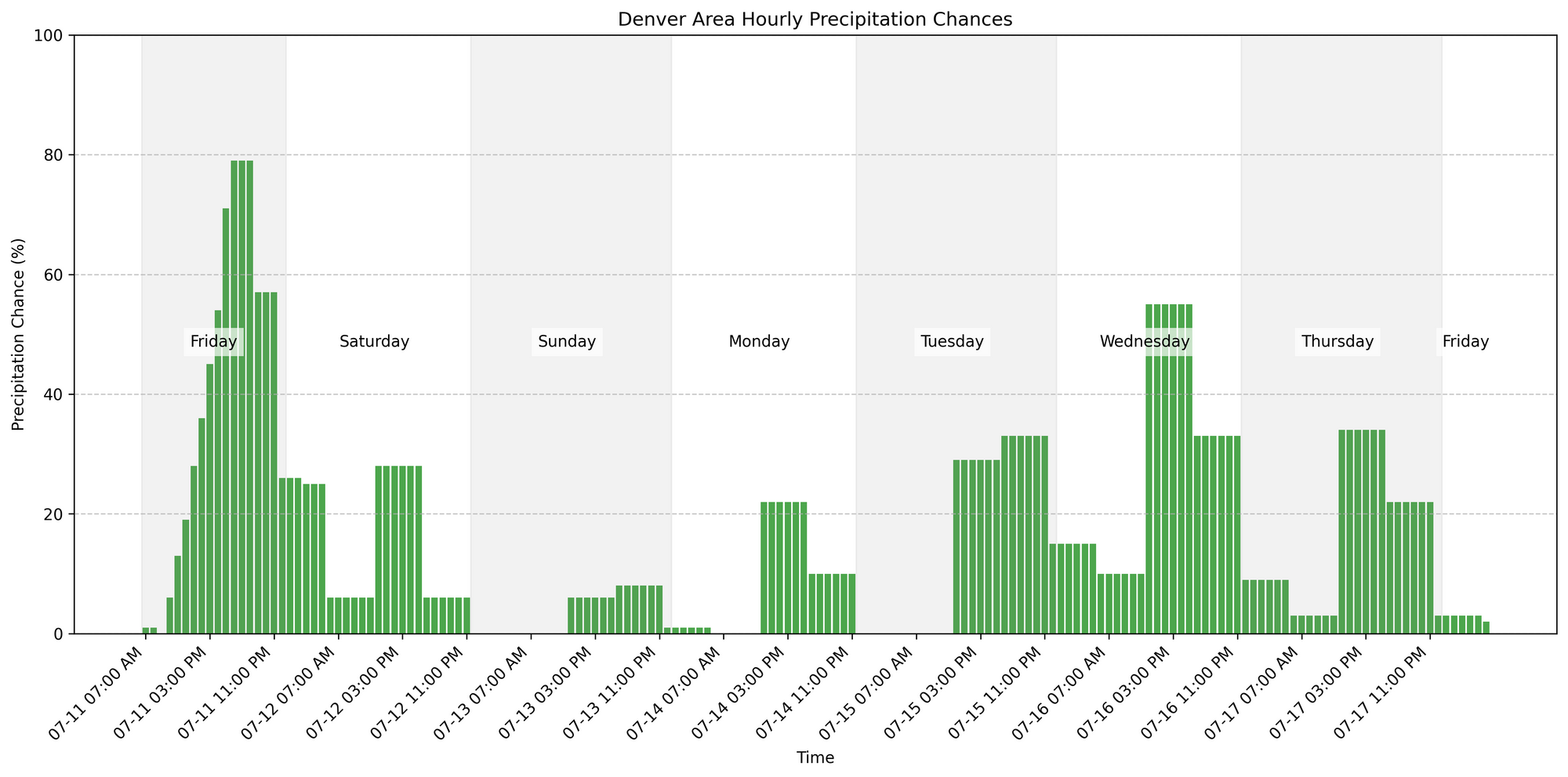 In detail: After a warm and increasingly cloudy Friday, scattered showers and thunderstorms are expected to roll off the foothills into the Denver area by mid to late afternoon. Some storms could produce heavy rain and localized flash flooding, particularly from the foothills out onto the plains. Showers may linger into the evening before tapering off overnight.
