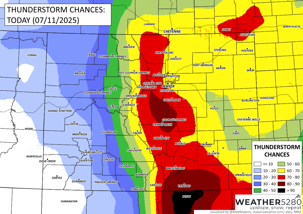 In brief: Expect scattered afternoon and evening thunderstorms Friday and Saturday across the Denver area, with a warmer and drier day Sunday. More storms return next week. Severe storms are more likely to form in Northeastern Colorado along the Wyoming and Nebraska state lines.