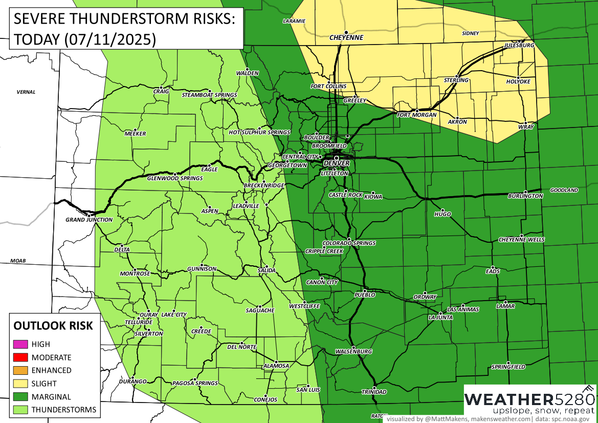 Although the higher risk of severe storms is to the northeast of the metro area, the chances of getting a thunderstorm is highest along the Front Range Mountains and into Colorado Springs.