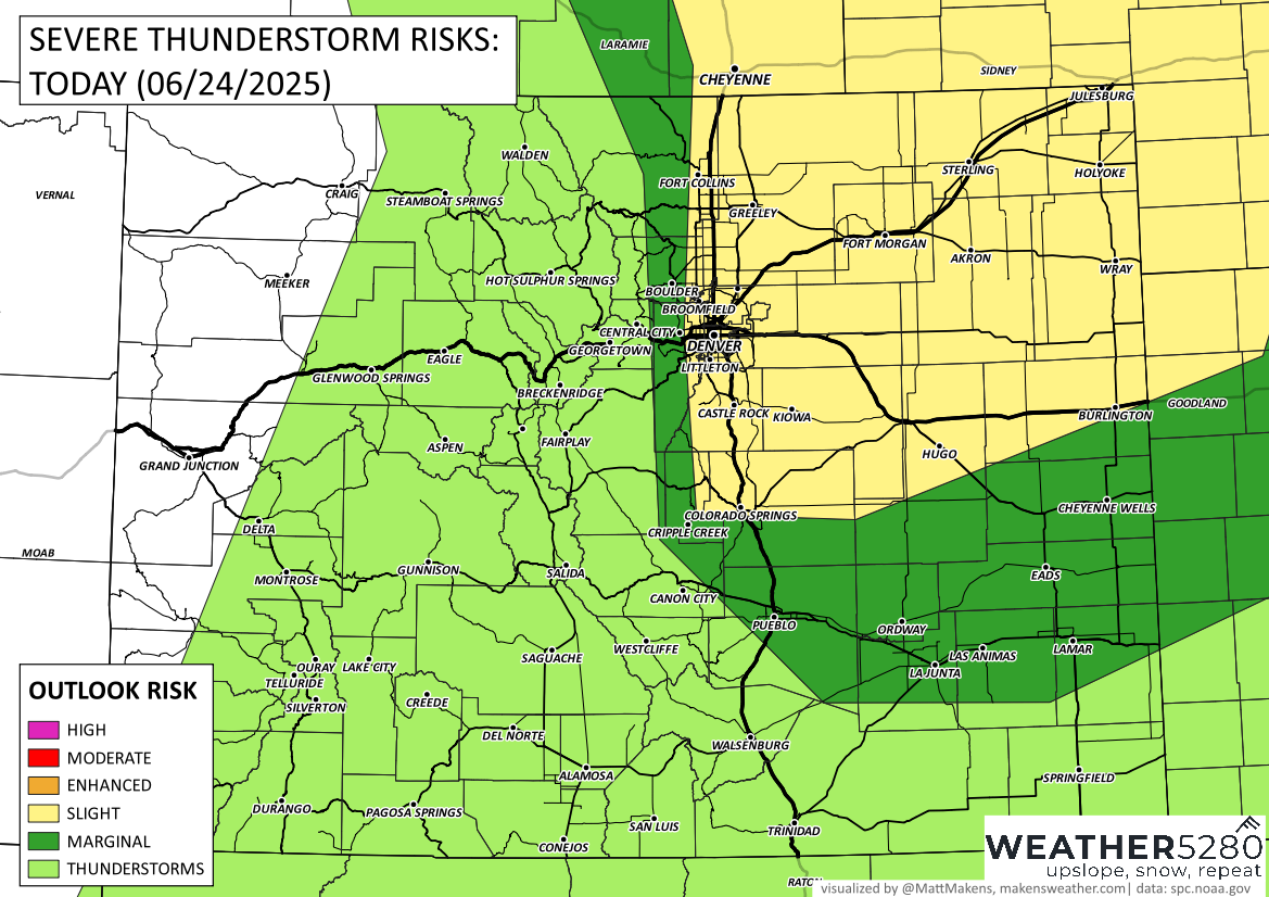 In detail: Get ready for an active weather afternoon across eastern Colorado, especially for those along and east of the I-25 corridor. Strong to severe thunderstorms are expected to develop early this afternoon and move east through the evening hours.