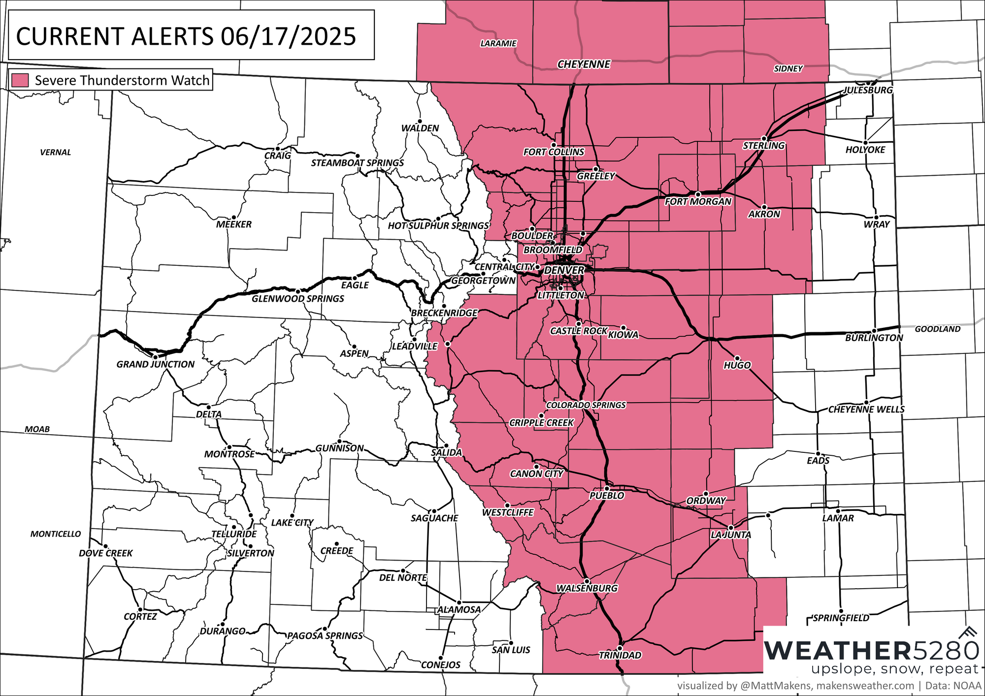 In detail: After a rare round of overnight thunderstorms, including some severe storms, we’re in for another active afternoon across eastern Colorado. A Severe Thunderstorm Watch is already in effect through 5 PM, covering much of the I-25 corridor, including Denver, Boulder, Fort Collins, and Colorado Springs.
