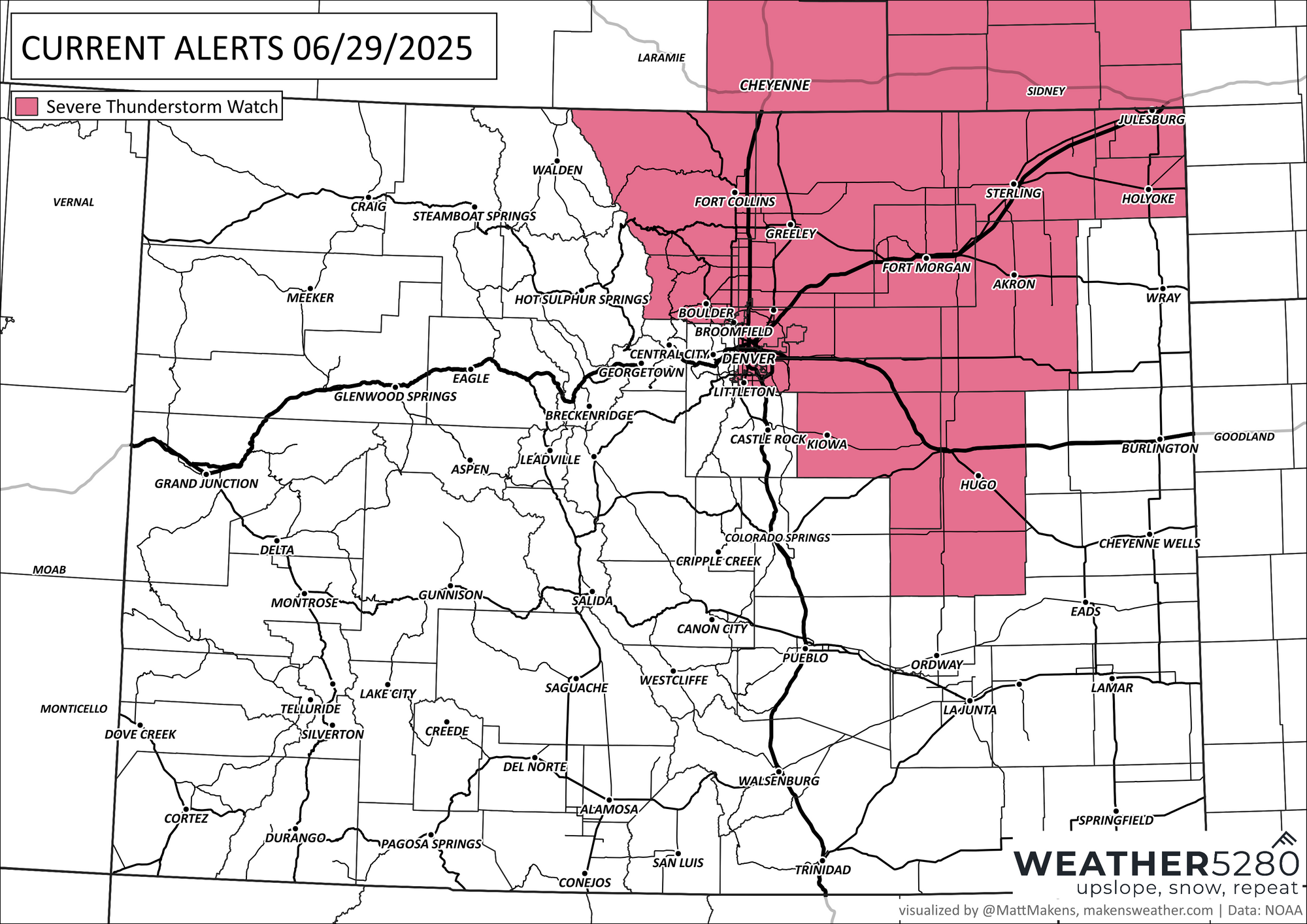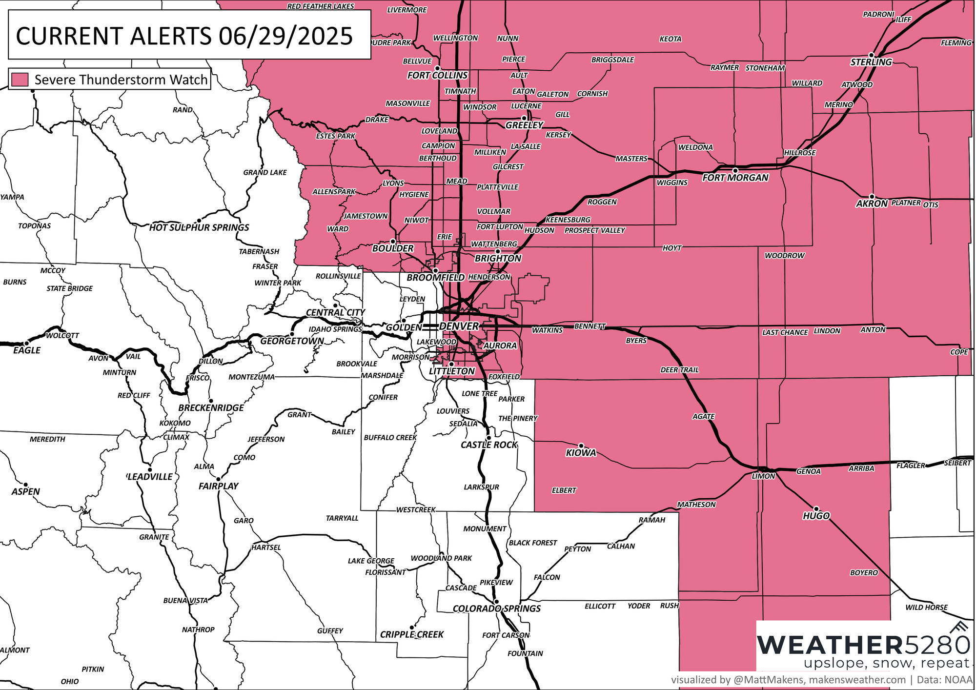 In detail: Severe thunderstorms are possible this afternoon and evening along the I-25 corridor and across the northeast plains, including the Denver metro area. A Severe Thunderstorm Watch is in effect until 9 PM. The main threats will be large hail and damaging wind gusts, especially from mid-afternoon through early evening.